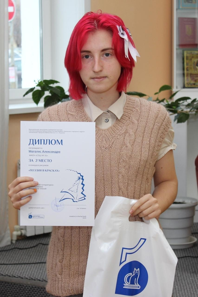 2 ноября в библиотеке им. А. С. Пушкина подвели итоги конкурса. Жюри высоко оценило работу нашей ученицы: Александра Магаляс получила Диплом за 2 место.