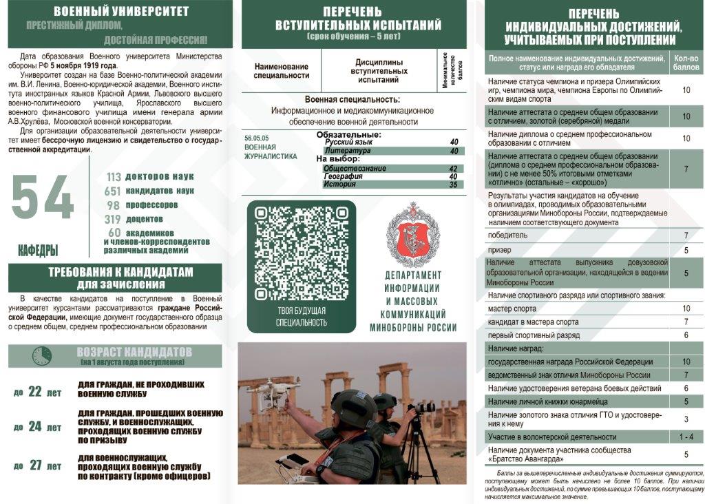 Военный университет имени князя Александра Невского Минобороны России предлагает специальность «Информационное и медиакоммуникационное обеспечение военной деятельности» («Военная журналистика»).