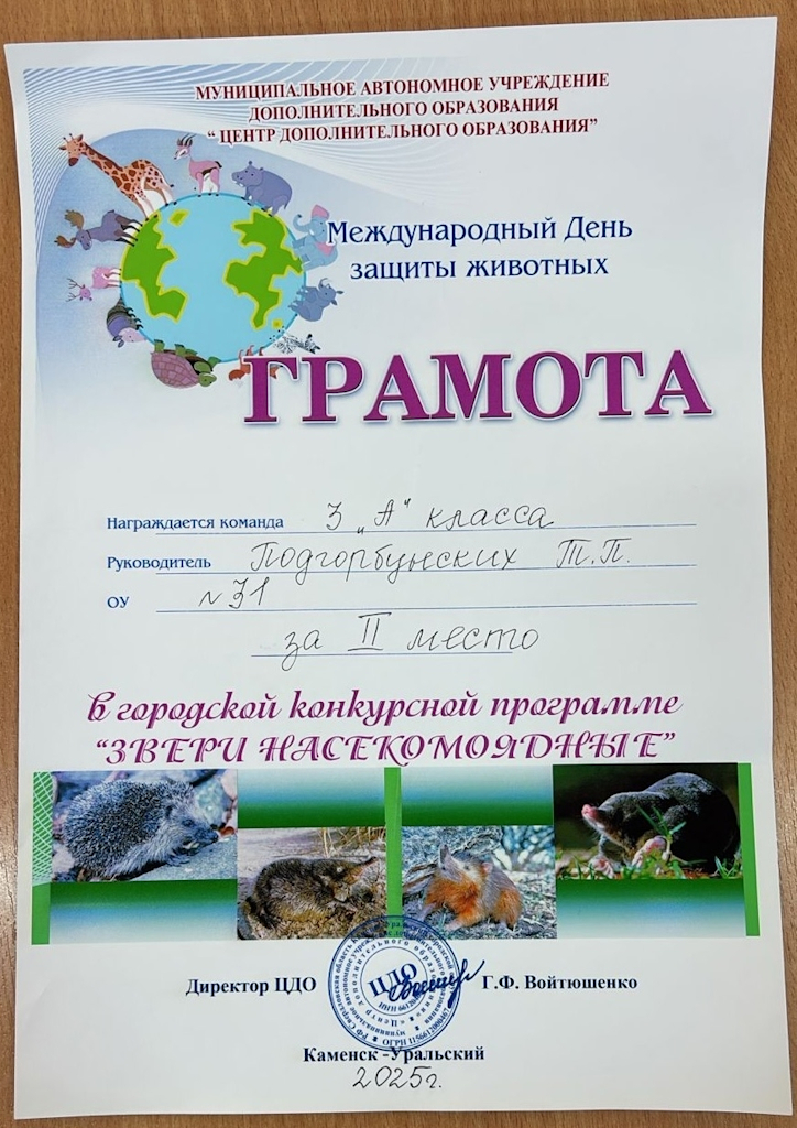 23 октября учащиеся 3 "А" класса: Денисова Есения, Ульянов Михаил, Бражкина Есения, Давыдова Владислава, Каргаполова Софья, классный руководитель Подгорбунских Татьяна Прокопьевна, принимали участие в городской конкурсной программе "Звери Насекомоядные", которая была приурочена Международному Дню защиты животных. Организатор мероприятия - Центр дополнительного образования.