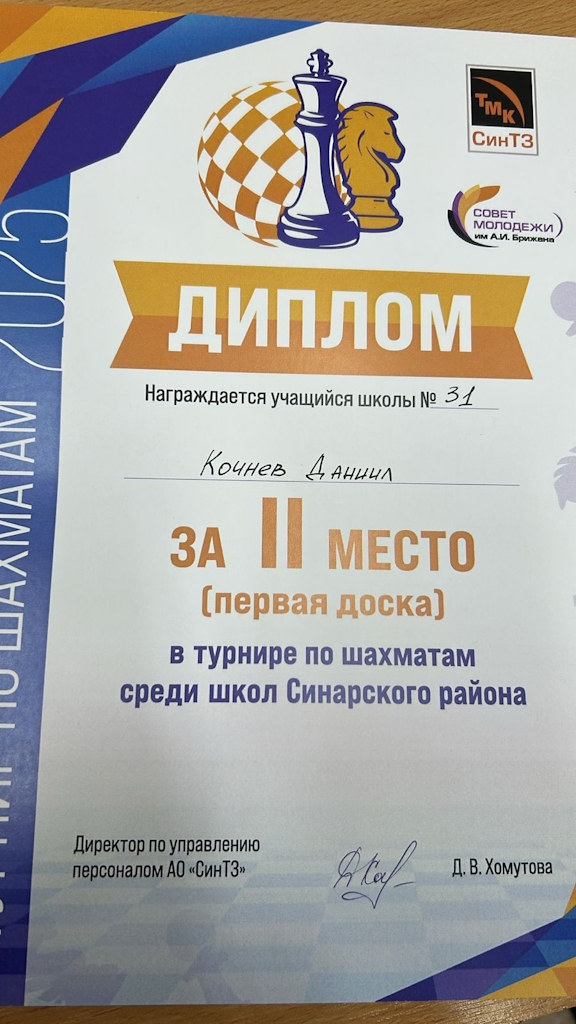 В течение трёх часов шли упорные шахматные бои. Каждому игроку нужно было выдержать несколько партий. Все стремились к победе, проявляя выдержку, стратегическое мышление и дальновидность. Кочнев Даниил получил 2 место на первой доске. Команда получила диплом за участие. МОЛОДЦЫ!!!