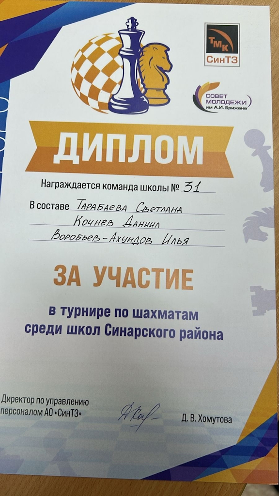 29 октября в "Шахматном клубе" состоялся командный турнир по шахматам среди школ Синарского района. Нашу школу на турнире представляли: Кочнев Даниил, 9 "А" кл, Воробьев-Ахундов Илья, 10 "А" кл, Тарабаева Светлана, 11 "А" кл.