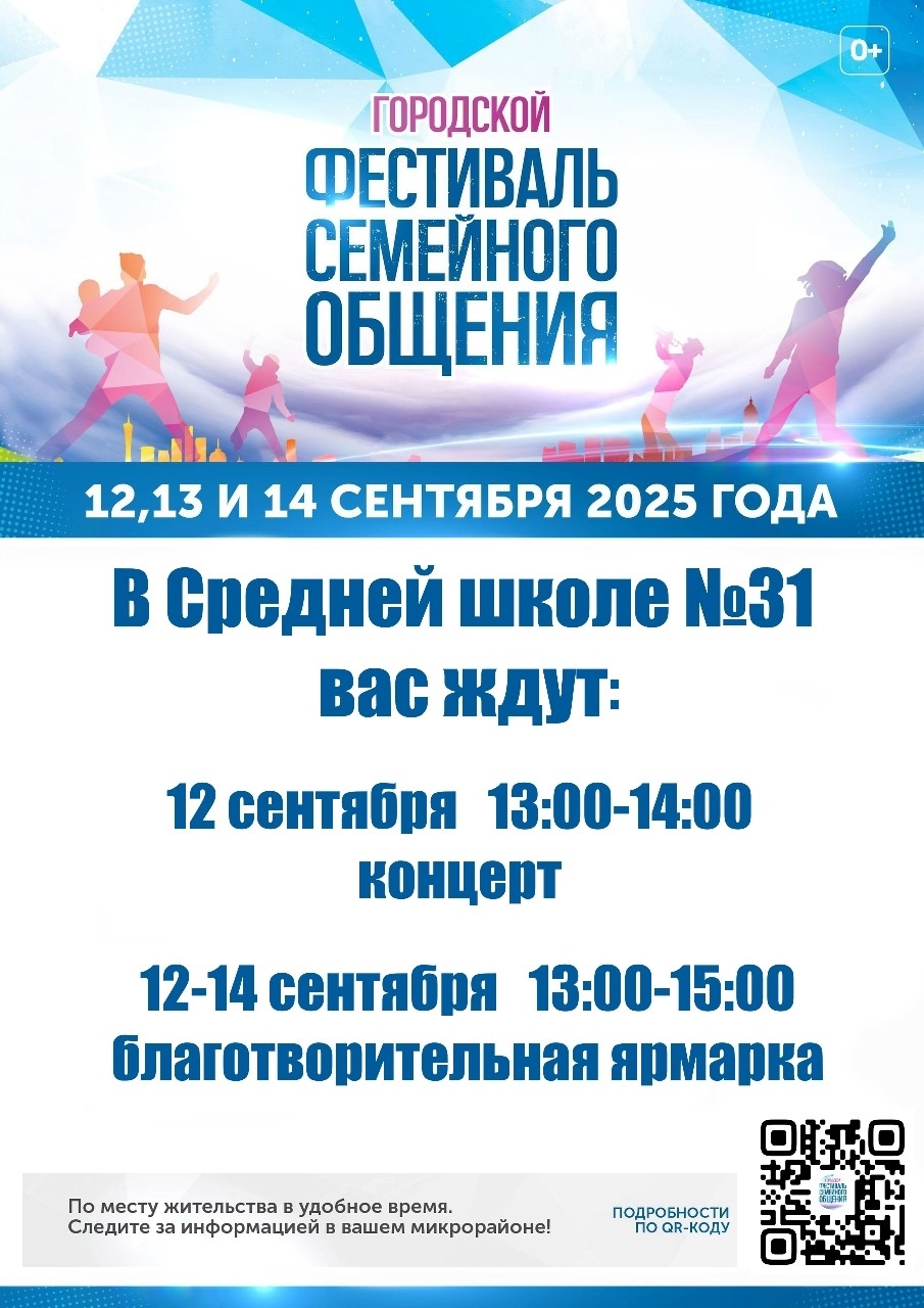 2-14 сентября наша школа становится одной из площадок городского "Фестиваля семейного общения". Мы приглашаем всех на зажигательный концерт, где вас ждут не только музыкальные номера, но и интересные конкурсы. Загляните на нашу благотворительную ярмарку! Также мы анонсируем запуск фото-флешмоба "Моя семья на выборах" в нашей группе ВКонтакте.