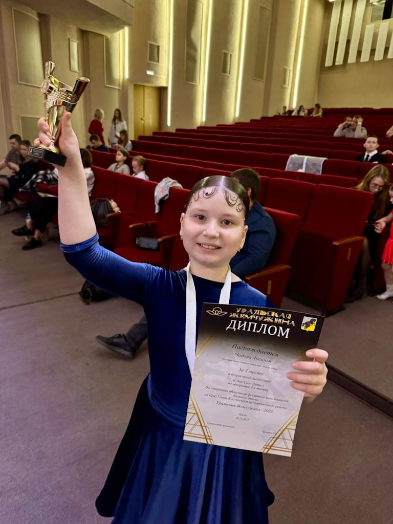 18 октября ученица 3 "А" класса Чадова Аксинья, приняла участие в открытом областном фестивале исполнителей бального танца на Приз Главы Каслинского муниципального района и заняла почётное 3 место по программе 2-х танцев! Мы поздравляем Аксинью и желаем ей и дальше радовать своих родителей победами!